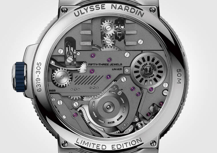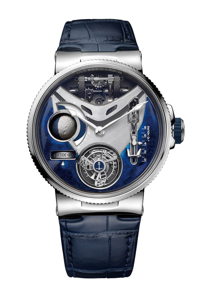 ULYSSE NARDIN雅典2019年在錶展結束了以後才正式發表了他們的旗艦款,這款Mega Yacht跟2016年發表的Grand Deck屬於同一個系統,兩款同樣都是在陀飛輪之類的高階複雜功能上頭再加裝了將航海中的機械元素高度視覺化了的裝置——而且賣點都是落在後者,構成了既能突顯品牌主題又極具賞玩趣味的作品。