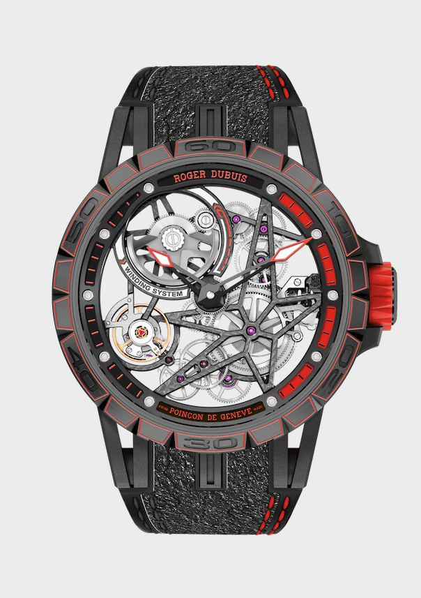 ▲羅杰杜彼近年與藍寶堅尼和倍耐力攜手推出多款聯名手錶,除了融合跑車和高級輪胎元素於手錶設計中,也透過配色例如黑色搭紅色展現屬於賽車的熱血氛圍。