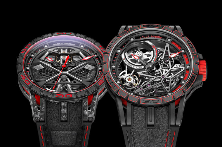 羅杰杜彼與藍寶堅尼賽車部門攜手結合高端科技與從汽車世界獲取靈感的前衛設計所創造出的果敢之作:Excalibur Huracán Performante,完美見證「當工程師的超卓遠見與製錶師的非凡創意相遇時」所激發的璀璨火花。該款手錶與其同名的超級跑車同樣具備著高性能、輕盈度和安全性;搭載獨特「引擎」:配備12度傾斜擺輪的RD630機芯,並從超級跑車的形態特徵中借取強烈鮮明的視覺元素,以各種詮釋呈現在整個時計中,如象徵「引擎室拉桿」的X型設計,顯眼的六角形進氣格柵,超跑輪框造型錶冠及自動盤,皆以縮影形式體現於腕錶上。