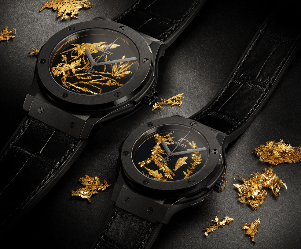 宇舶近期推出一款結合黃金結晶的經典融合系列黃金結晶體手錶,手錶面盤以黃金薄片組成的黃金結晶所裝飾,正如同精美的藝術畫作需要搭配最適合的畫框。此次共有38毫米與45毫米兩種尺寸,搭配黑色鱷魚皮結合天然橡膠錶帶,使佩戴者能舒適的將珍稀的藝術極品戴在手上。