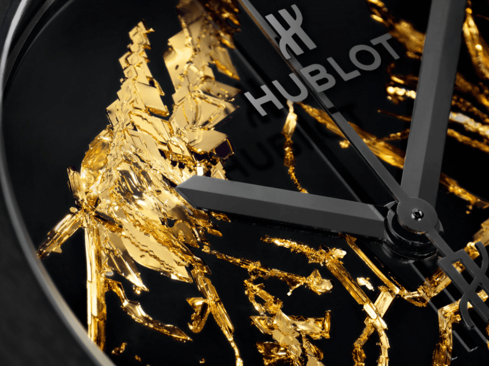 黃金被開採時會呈現薄片的形態,若是在自然條件下形成黃金結晶的狀態實屬罕見。透過宇舶錶眾多工程師的專業學識與技術,黃金得以呈現其最獨特的型態:黃金結晶。宇舶總廠的研究與開發部門,將黃金在最純粹的24K金型態下加溫到熔點,創造出黃金粒子流,類似挾帶著黃金原子的蒸氣,因熱向上飆升後,在接觸到低溫時凝結成結晶,完全隨機的結晶形狀以至於沒有任何黃金結晶會是一模一樣的,也使得每一只手錶都是獨一無二的。