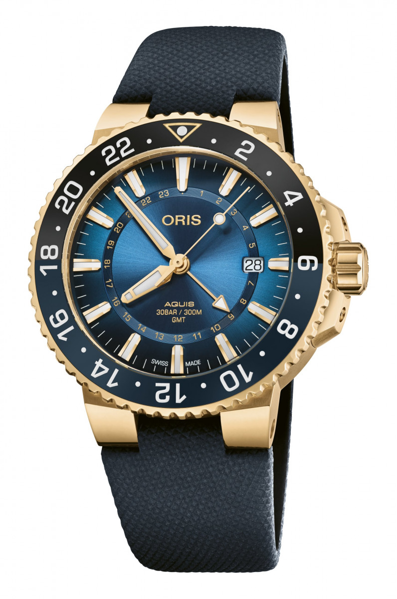 除了3點方向的日期窗,面盤內圈還有另一枚24小時顯示環,搭配中央軸心的第四根指針用以指示第二地時間,黃色GMT針在藍色面盤上對比強烈,因此佩戴者也不容易跟同在中軸上的所在地時、分、秒三針搞混。以實用性來說,Aquis GMT兩地時間錶比起基本三針或是計時功能等可能在我們出國時更能派上用場;以專用潛水錶角度來說,包括少了錶圈倒數計時刻度以及將錶圈改成雙向旋轉多少弱化了錶款的專業性能。不過這款無論就材質或限量數來說對品牌而言都很少見,雖然價格高出一般ORIS手錶許多,但是它的收藏意義相對也更高。