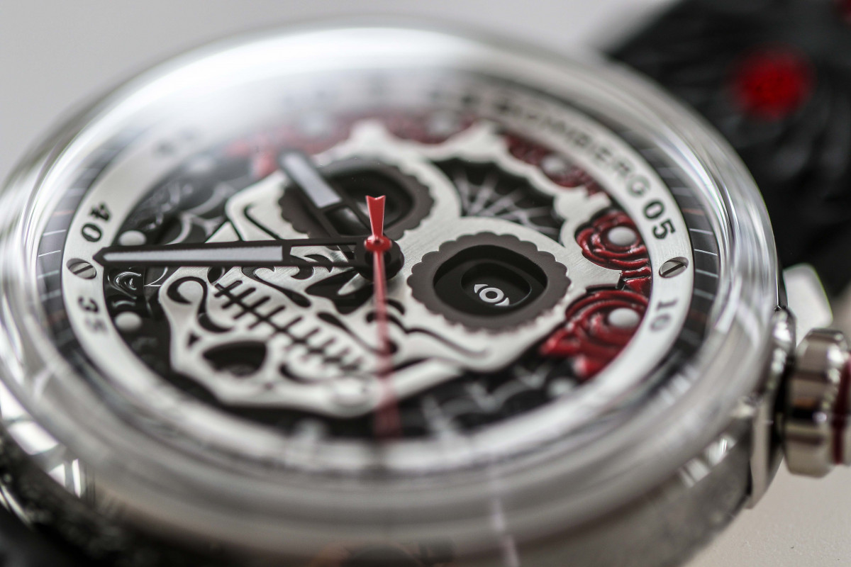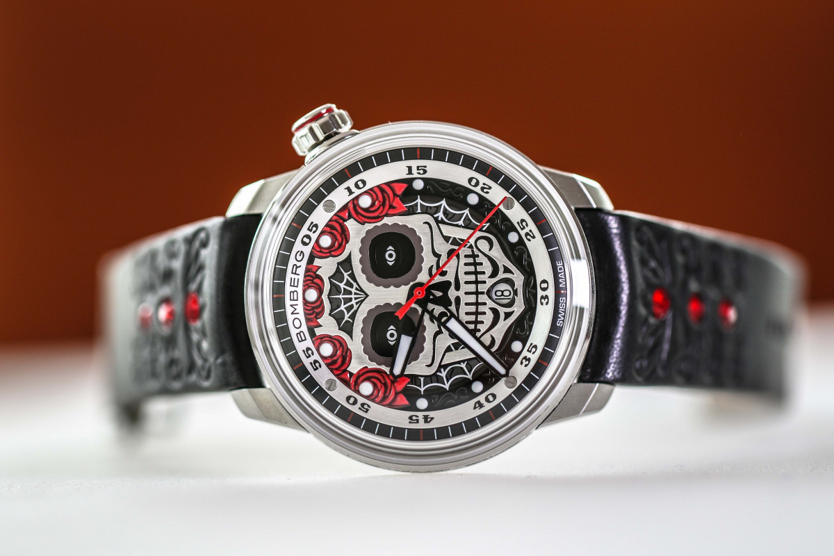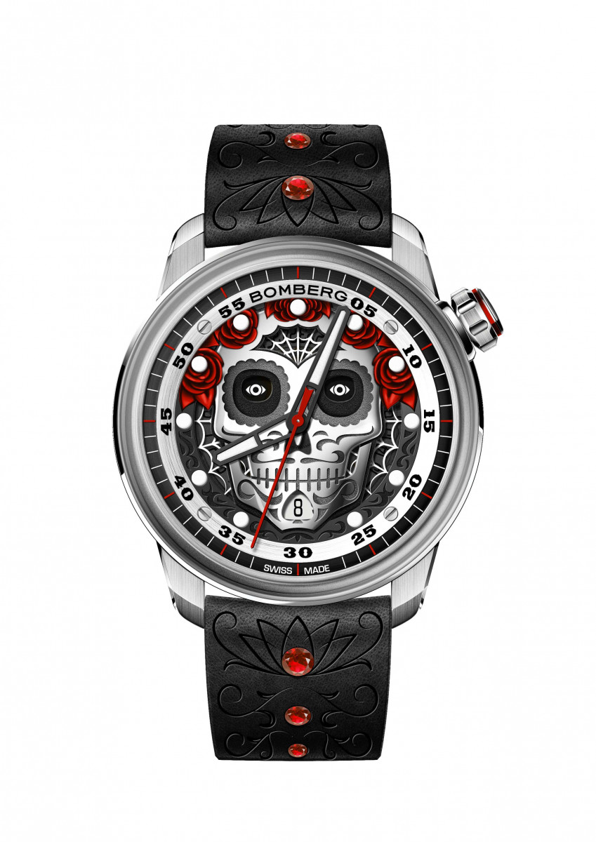 在BOMBERG的設計下,BB-01招牌的43毫米錶殼和2點鐘位置錶冠襯托壓印墨西哥骷髏頭(俗稱「Calavera」)的面盤。面盤展現鉅細靡遺的細節與豐富的裝飾,結合黑、白、紅三色組成的花朵與蜘蛛網浮雕,與時標和鏤空指針上的Super-Luminova™夜光塗層完美互補,即使在完全黑暗的情況下也能確保清晰可讀。