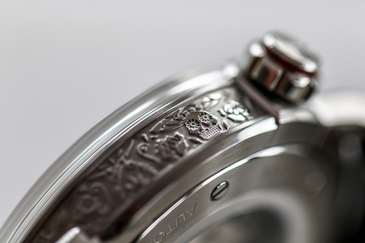 ▲在錶殼側邊也可以看到卡翠娜骷髏頭的雕刻。