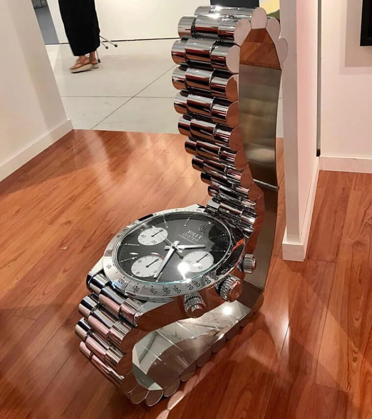 謎底揭曉,圖上的那個巨大勞力士其實並非手錶,而是一張椅子!它是一件由義大利藝術家Damiano Spelta所設計的普普藝術風格家具,Damiano Spelta的作品常從生活中取材,一些平常唾手可得的事物如魔術方塊、巧克力、羽毛球、口紅等等,也有像手錶、包包以及汽車等,在他的創意翻玩下變得超過我們的想像,例如原本的勞力士手錶就變成了XOLEX座椅。Damiano Spelta分別採用鋼、鋁、黃銅和玻璃等素材來製作這張長得像手錶的椅子,它的尺寸則是有43.3cm(長)x78.3cm(寬)x93.9cm(高),因為使用的是金屬零件,重達也有70公斤,看起來也是滿堅固穩重的。