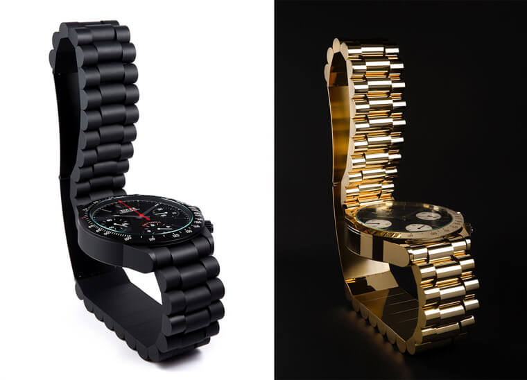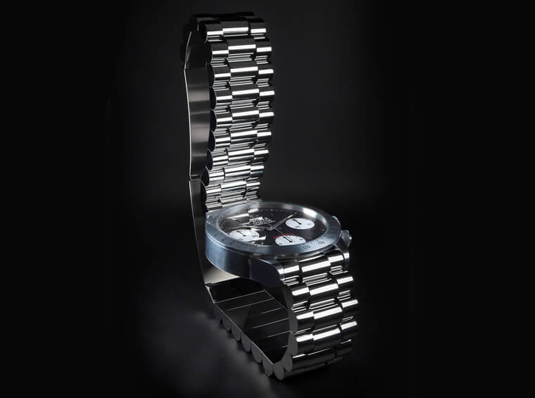 仔細看一下這張XOLEX座椅,它的細節都有把Daytona的神韻做出來,包括錶殼與鍊帶造型、錶圈上的測速計課的、三眼面盤以及指針造型等等都做得唯妙唯肖,而鍊帶延伸出的椅背和椅腳也融合了人體工學的考量,甚至在鍊帶的中空空間中還可以衍生出置物功能,可見創作者設想得滿周到的,這張椅子除了有看起來不鏽鋼的版本,也還有鍍黑和鍍金版本,小編還滿好奇這樣一張椅子不知道售價會是多少,如果買一張放在家裡應該會讓家中客人都感到超羨慕。