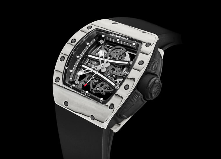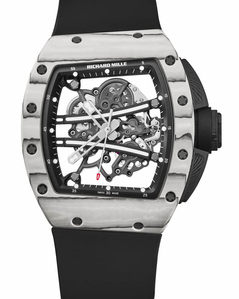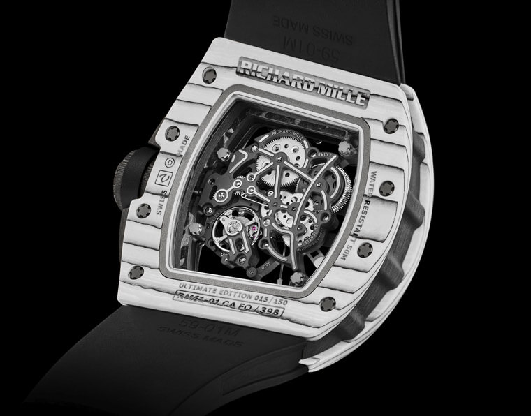 RM 61-01終極版腕錶的錶圈和底蓋使用Quartz TPT®石英纖維和Carbon TPT®碳纖維取代過去的TZP陶瓷,並在中層錶殼部分運用Carbon TPT®碳纖維強固整體結構。在厚度不超過45微米的二氧化矽纖維層中插入Carbon TPT®碳纖維層,經由自動化機器進行層疊處理,使得層與層之間的纖維絲以45度角的方向交錯。這種複合材料需在高壓釜中以6巴的壓強下加熱到攝氏120度之後,便可以在RICHARD MILLE的工廠中加工成型。