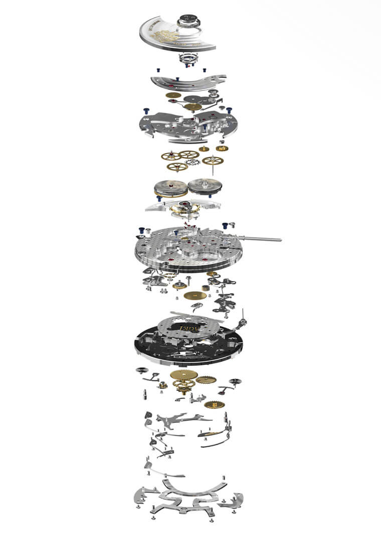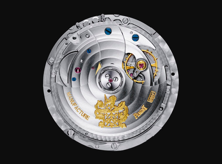 錶款搭載機芯厚度僅5.6毫米的855P超薄萬年曆機芯。這款機芯除了具萬年曆基本顯示如日期、星期、月份和閏年顯示外,如前所述它還具備日期、星期逆跳以及雙針兩地時間日夜顯示這兩個個人特色,原本傳統的高階萬年曆機芯結構就已經相對複雜,這款又再附加更多的走時變化機制,使得機芯零件數增加到343枚之多,展現微型複雜工藝的本質。