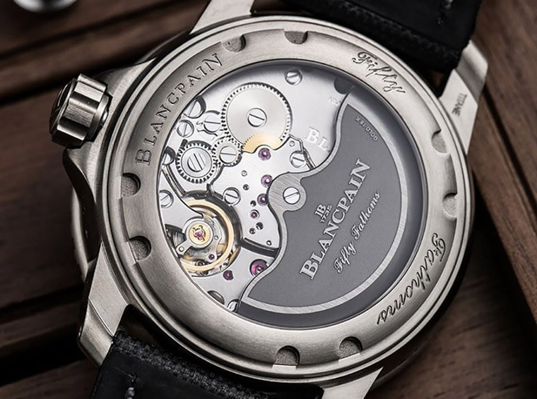 寶珀現行的大三針+大日期款式搭載的機芯幾乎都是由FP1150加裝大日期模組而來的6950,FP1150是寶珀乃至於同集團其他高階品牌最常採用的基礎機芯,機芯的厚度既薄,便於追加各種模組,在市場上流通的也久,經歷過充分的考驗。不過這款大日期五十噚搭載的卻並非6950,而是由寶珀自製的1315另加大日期而成的6918B;現行的三針款五十噚裝的多半都是1315,不過近年也有少數款式開始採用FP1150系統的機芯,比較使用兩種機芯的錶款會發現裝FP1150的尺寸多半較小,相較於標準五十噚的45mm,它們可能只有40.3mm,厚度也較薄,對比上兩種機芯之間的大小差異這樣的選擇就很合理了,從這套邏輯來看屬於標準Size的大日期款自然也應該使用1315。