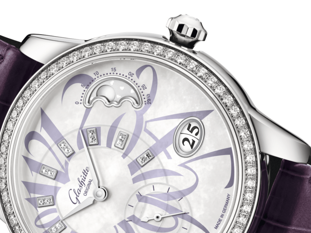 GLASHÜTTE ORIGINAL格拉蘇蒂原創2020年的新品第一發就獻給全世界的女士,推出全新PanoMatic Luna大日期月相錶,此手錶面盤柔和又俏皮,搭配鑲鑽長方形時標和在中間組成一顆愛心的紫丁香色阿拉伯數字,為女士系列增添又一柔美傑作。