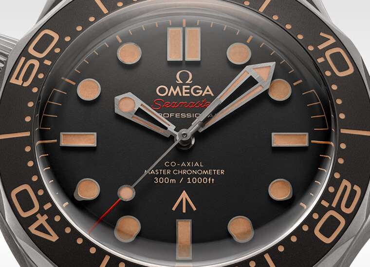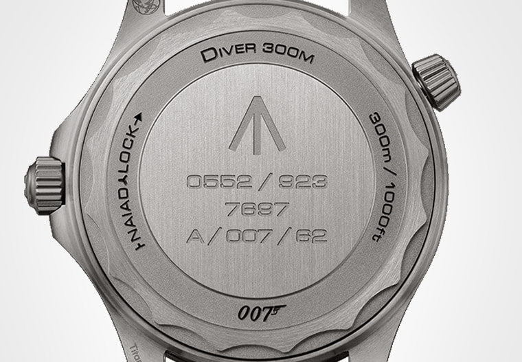 據說丹尼爾‧克雷格在《生死交戰》裡就是佩戴這款海馬潛水300米007限定款,所以他本人也有參與手錶的設計過程,尤其是「復古風格」這塊,所以歐米茄採用米黃色Super-LumiNova夜光塗料塗在刻度、時標與指針等部位,打造出所謂的Tropical風格。另外包括錶圈部分,現在的海馬潛水300米幾乎都是使用陶瓷錶圈了,唯獨這款007限定款反而是回到比較舊式的鋁圈,用意想來也是為了配合復古主題,但要注意的是它的耐刮、抗磨損效果就不如陶瓷圈出色了。(也有說法是歐米加採用鋁材質製作面盤、錶圈等部分是為了降低手錶的重量,提升佩戴舒適性)。此外這款007限定款還有個不一樣的地方在於它捨棄透背改用實底蓋,底蓋上刻了一些奇妙的數字,一一解讀的話分別是:”0552”是海軍人員的獨特代號、”923 7697”是潛水錶的代號。字母”A”是手錶採用旋入式錶冠的代號,而007當然就是龐德經典的探員編號,數字”62”代表第一部龐德電影上映的年份。底蓋由於應用歐米茄專利的Naiad Lock系統,由此確保底蓋上的數字和圖案在鎖緊後一直保持正面面對佩戴者。