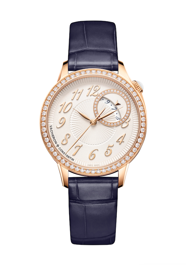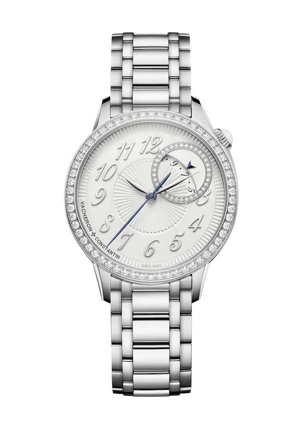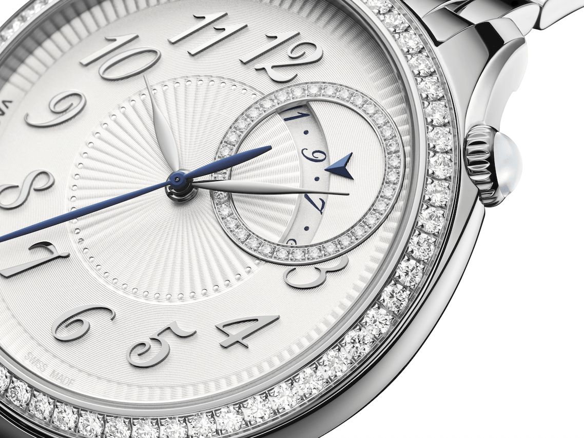 微弧型錶殼直徑35毫米,纖細優雅的錶圈鑲有58顆鑽石。一體式錶耳自錶殼延伸而出,一點半鐘位置的錶冠鑲嵌有一顆弧形切割月光石,散發柔和的光影。精美的乳光銀色面盤受高級訂製時裝啟發,中央的同心圓和外圈均飾有褶皺紋飾。這一紋飾效果歷經數月調試,由品牌的機刻雕花工坊運用傳統的「織錦 」工藝製成。為了在面盤上以大尺寸圖案為範本,把圖紋微縮至面盤上,藝 術工藝大師花了大量時間把一台1904年的縮放儀的齒輪進行微調,熟練操作磨到極尖的雕刻刀並由工匠定期削尖,最終完成了面盤上的褶皺紋飾。
