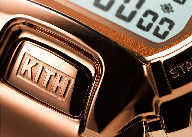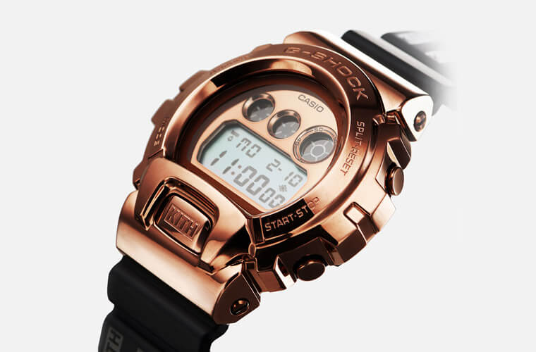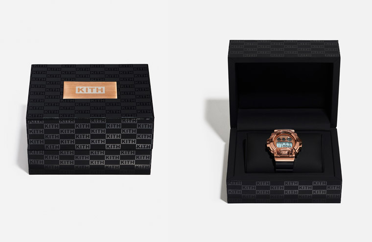 CASIO G-SHOCK為慶祝6900系列滿25週年,特別邀請潮牌KITH共同合作聯名錶款GM-6900,以首次採用金屬錶圈設計的GM-6900為基礎錶款,KITH運用精緻的玫瑰金色調營造出古銅感氛圍,下方的照明按把特別刻印上KITH立體字樣,錶款搭載快拆錶帶裝置,可隨興更替黑或白的樹脂錶帶,錶帶上並印有KITH Logo排列組合字樣,Monogram的設計風格延續至全黑的錶盒上,滿版的棋盤格Logo組合搭配上錶盒上方的玫瑰金KITH字樣,整體風格呼應錶圈設計。冷光照明部分亦充滿巧思,點亮照明燈後浮現品牌慣用招牌字樣"JUST US"。