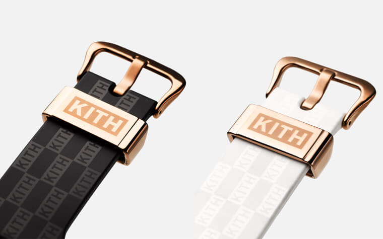 ▲錶帶上印有KITH棋盤格排列圖樣與錶帶環刻印KITH字樣。