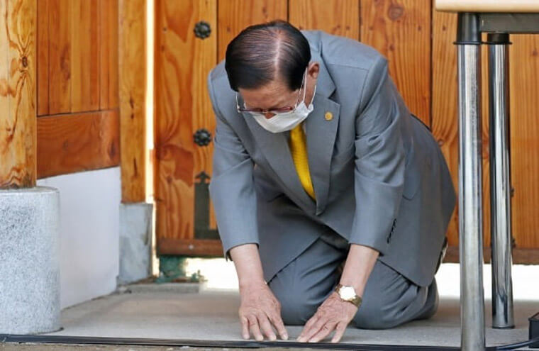 ▲南韓新天地教會教主李萬熙3月2日召開記者會針對教會被指稱散步武漢肺炎病毒一事向南韓人民下跪道歉。圖片:hankyung.com