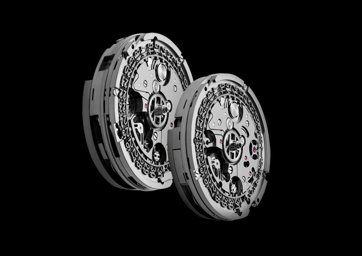 ▲HUB1280這枚新計時碼錶機芯以雙重離合機制與導柱輪而獨樹一格,導柱輪從錶盤正面即可欣賞得到。可獨立拆卸的擒縱系統橋板,增加了維修與調校的便利性。