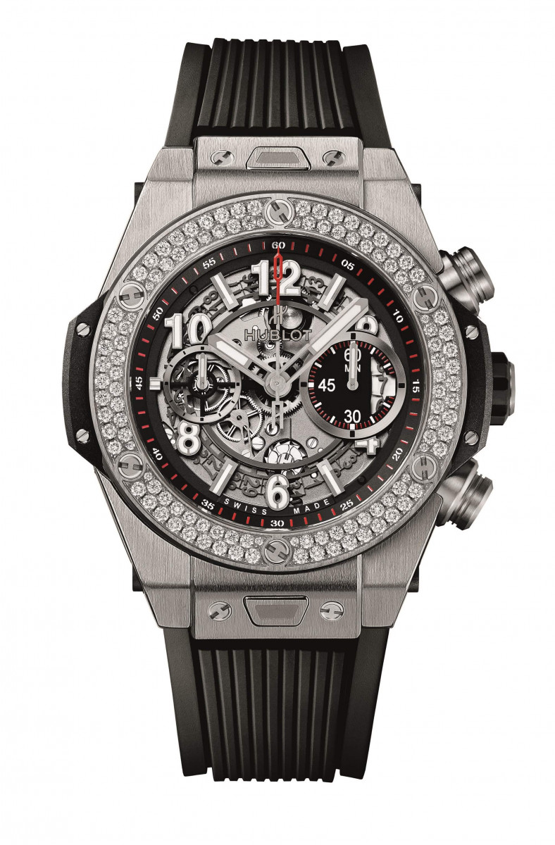 鈦金屬材質/HUB1280自動上鍊機芯/時、分、小秒、日期顯示/計時碼錶功能/藍寶石水晶鏡面、透明底蓋/防水100米/錶徑45mm/參考價:NT$ 782,000