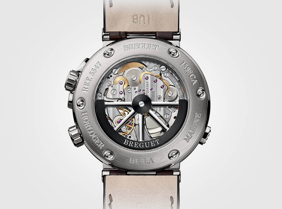 Marine 5547之所以會被認為具有高實用性,在於其結合了兩地時間以及鬧鈴功能,面盤3點方向設有鬧鈴設定錶盤,其有別於多數的鬧鈴錶可以進一步設定至小時與分鐘,便利性更高,至於12點方向則有鬧鈴顯示小圓窗、9~12點方向則有鬧鈴功能專屬的動力儲存顯示,以隨時提醒佩戴者要適時替腕錶補充動能。此外9點方向有一枚能直接顯示24小時的第二地時間小錶盤,兩地時間功能對於需要往返於不同國家的旅人而言特別有需要,寶璣周到的設計則是將腕錶的實用價值放到最大,這一切得力於品牌研發的519F/1機芯,這枚機芯由376枚零件組成,28,800震頻加上45小時動力儲存等規格皆在水準以上,藉由錶背的透明底蓋可以一窺機芯的精緻做工,包括其鏤空自動盤蘊含了船舵的造型元素以呼應Marine系列的航海本色,至於機芯基板、夾板的日內瓦波紋與魚鱗紋等修飾則展現出品牌製錶工藝的高度,另外補充一提,它的擒縱系統蘊含矽游絲零件,除了不需上油潤滑,機芯的抗磁性能也獲得提升,易言之腕錶的走時精準度也更能令人放心。