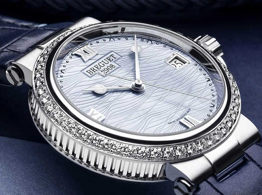 ▲有別於一般作為腕錶裝飾的珍珠母貝面盤,寶璣在Marine Dame 9518身上更導入品牌擅長的機刻雕花工藝,工匠耗費大量心力刻鑿出狀似海浪的Marea紋路,使得珍珠母貝面盤看起來生動而細緻。