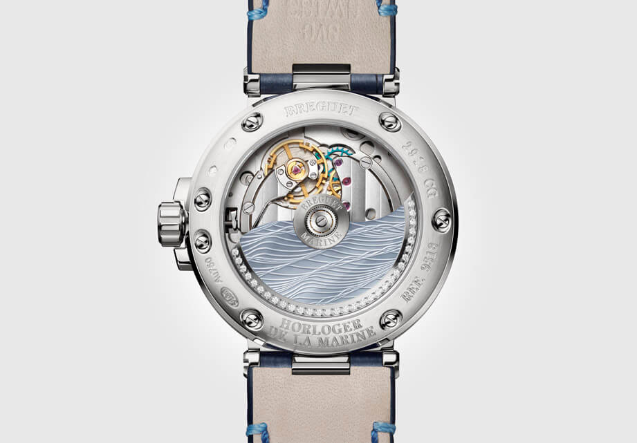 Marine Dame 9518搭載591A自動機芯,這枚機芯先前曾在Classique系列中亮相,此次移植到Marine系列又有了令人驚豔的微調——原本只採用機刻雕花的自動盤不僅表面鑲上了同樣帶有”Marea”紋路的淺藍色珍珠母貝,寶璣還在自動盤邊緣鑲上多達31顆鑽石,一方面有著裝飾效用,同時也因為鑲嵌鑽石後增加了重量的關係,間接有助於提升機芯的上鍊效率。此外透過透明底蓋可以一窺機芯配備先進的矽質擒縱裝置零件與矽游絲,即使錶款只是基本的大三針加日期顯示功能,但是整枚機芯的零件多達219枚,高級品牌致力追求完善的境界由此可見一斑,從機芯4Hz震頻及採用配重螺絲微調系統來看,腕錶的走時精準度無庸置疑,提供Marine Dame 9518在唯美外型下同樣保有紮實而穩固的內部性能。