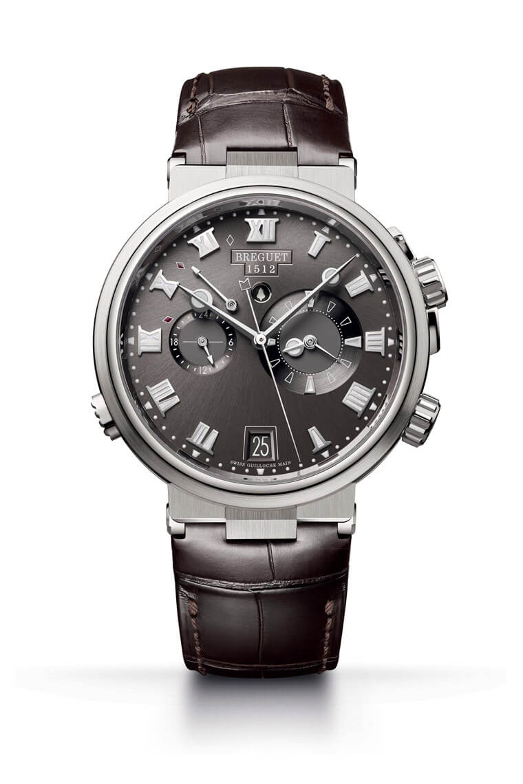 新版Marine於改款後的隔年推出數款不同功能與材質的款式,其中就包括採用鈦金屬材質、搭配皮錶帶及岩灰色面盤的Marine Alarme Musicale 5547(以下簡稱Marine 5547),錶款所具備的功能性是被公認為實用性相當高的作品,以結婚對錶的角度,挑選這款Marine 5547無疑是「一次到位」的選擇。新版Marine的外觀承襲前作的典雅圓殼造型,包括作為航海運動錶本質而配備的錶冠護肩也不變,不過寶璣仍微調了部分細節,包括錶耳從原本的柱狀改成與錶殼一體成型的樣式、錶側的錢幣紋間距加寬,使整體看起來更有運動錶的粗獷豪氣,此外這款Marine 5547搭配的是棕色鱷魚皮錶帶,如此一來腕錶又衍生出一股優雅的氣質,能靜也能動的特質剛好符合目前市場的需求與渴望。