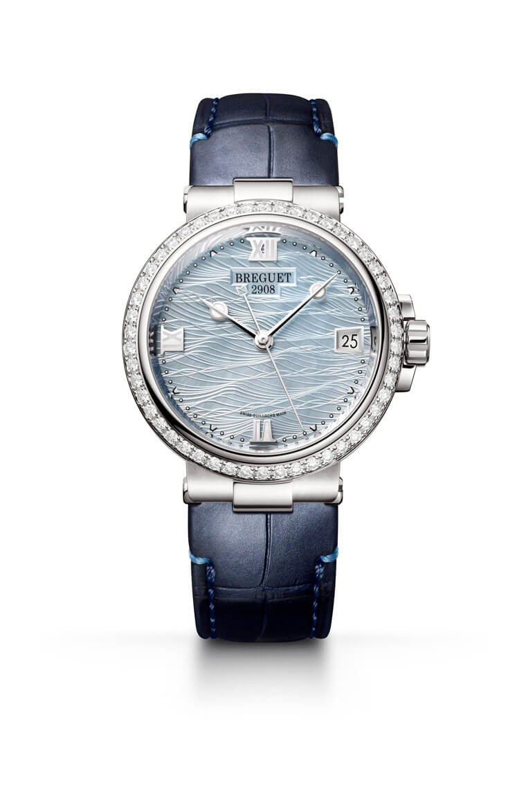 白金版的Marine Dame 9518採用淺藍色珍珠母貝面盤(相較於玫瑰金版則是採用白色珍珠母貝),考量到與面盤的搭配性,因此寶璣再替白金版配置了藍色鱷魚皮錶帶其實是順理成章。提到面盤,這絕對是Marine Dame 9518的一大工藝亮點,綜觀寶璣旗下腕錶,面盤的裝飾工藝向來為品牌強項,歷來我們也看過許多在單只錶上集結不同機刻雕花工藝的寶璣腕錶力作,Marine Dame 9518再度延續了品牌擅長的機刻雕花工藝美學,不同的是在這款錶上並非是在金屬上雕刻出紋路,而是在質地較脆弱的珍珠母貝上雕刻,從中反映出寶璣爐火純青的機刻工藝技巧;為了呼應Marine系列的航海淵源,寶璣在Marine Dame 9518面盤精雕上的圖案有個特別的名稱”Marea”(海潮之意),寶璣的機刻工藝師利用不規則的有機曲線勾勒出海浪起伏有致的層次,這有別於我們印象中機刻雕花就是工整而規律的樣式,事實上要用機刻工具雕出這種海潮圖案並不容易,品牌為此甚至製作專用的凸輪加裝在工具上,最終才得以在珍珠母貝面盤上捕捉猶如海面波光瀲灩的美景。由於女錶尺寸較小,寶璣在面盤格局方面也做出細微的改動,例如羅馬數字時標僅鑲附在6、9、12等三處(3點方向由於設置日期窗所以省略時標),如此一來能讓腕錶看起來更俐落,也使珍珠母貝面盤的機刻雕花可以保有更寬廣的舞台。