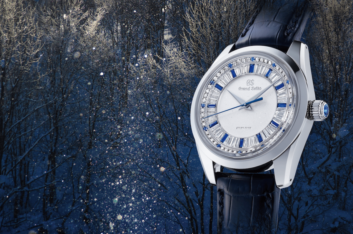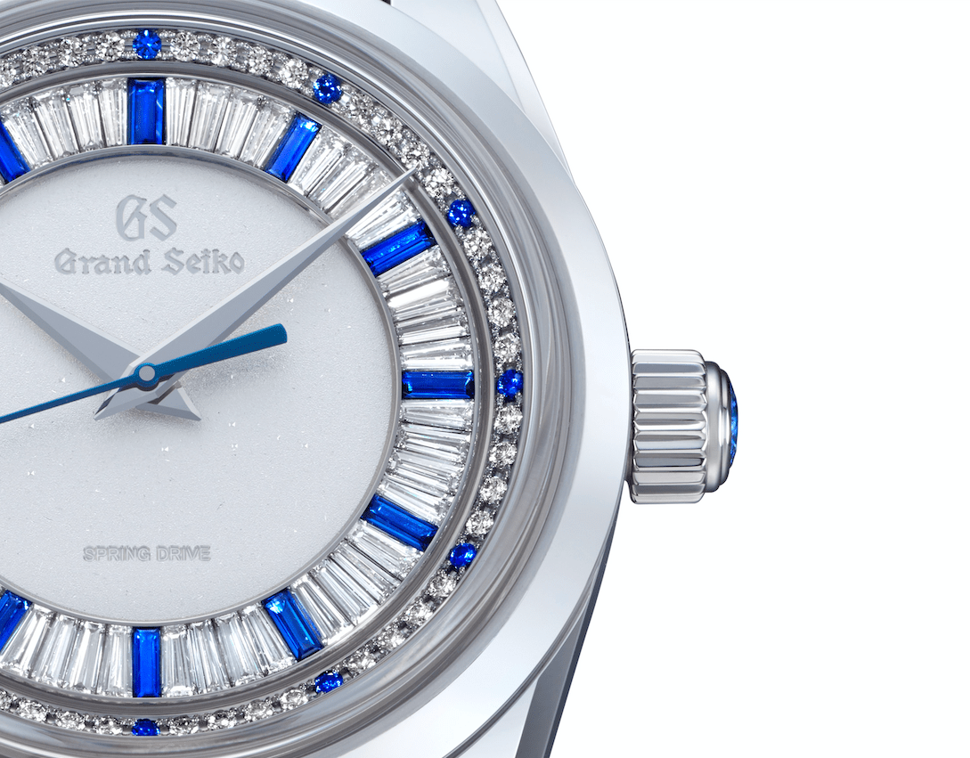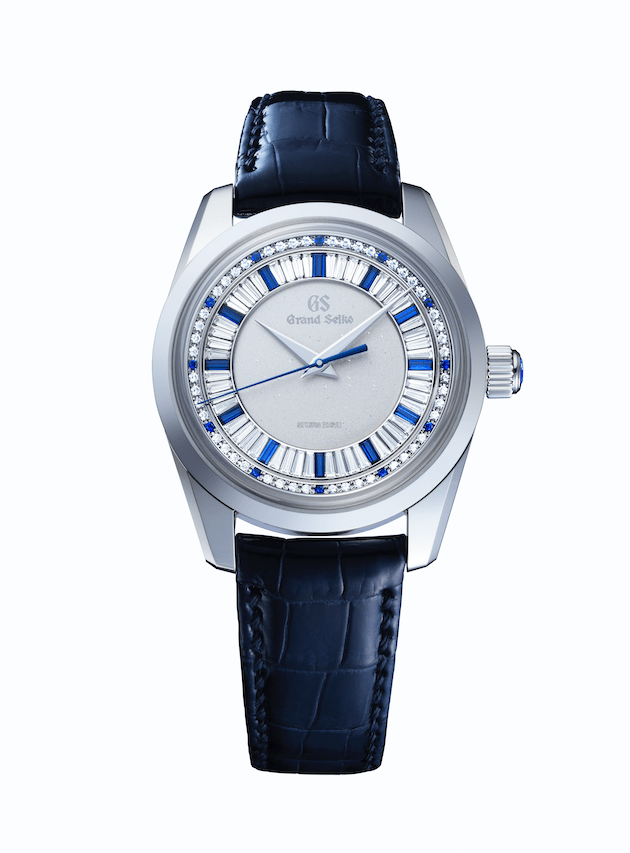 在信州地區寒冷、晴朗的早晨,小冰晶會發出閃爍微光,此錶的面盤中央便是從這個景象汲取靈感,利用「鑽石沙」紋理營造微妙光芒與獨特美感。經過精心挑選與切割的梯形鑽石與藍寶石鑲嵌在18K白金鑲座上並化身環繞面盤的分標與時標。鑽石與藍寶石的高度一致,這樣才能反射均勻光線,12點鐘藍寶石則比其他藍寶石寬一點,確保完美易讀性。在時標與分標的外圍,48顆額外鑽石與12顆藍寶石個別鑲嵌,讓面盤顯得更加美麗動人。