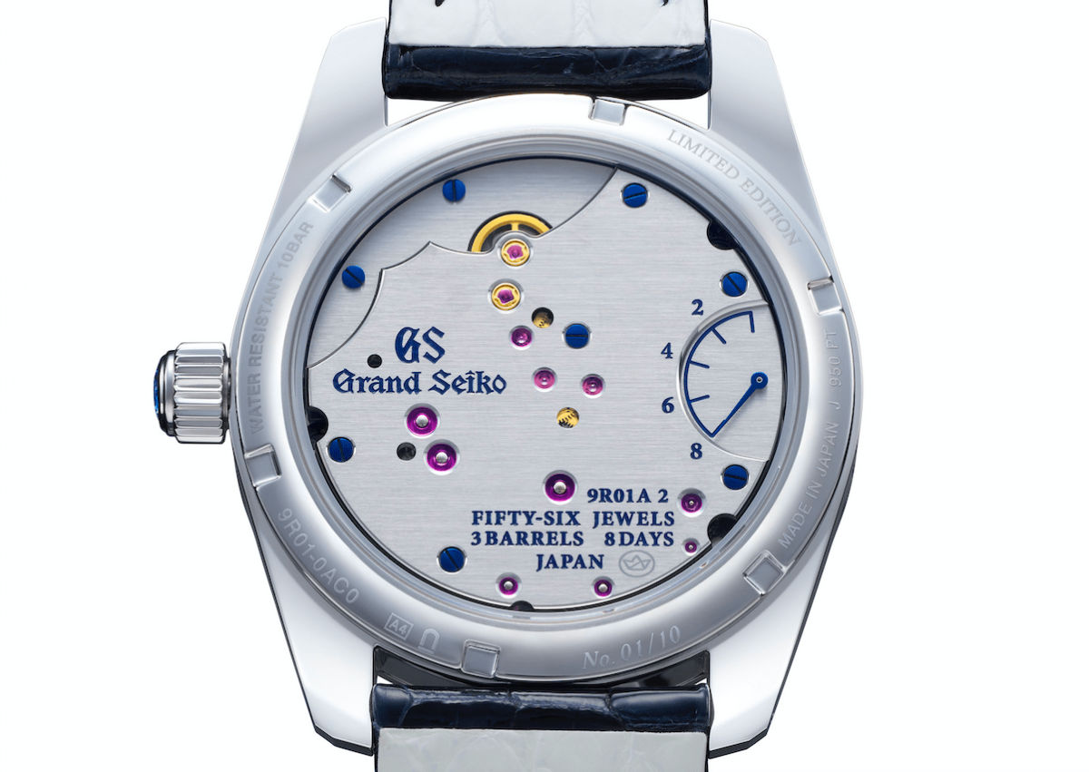 此錶由Spring Drive手動八日鍊Caliber 9R01機芯驅動,此機芯是信州腕錶工房 Micro Artist Studio 的高級製錶師團隊一手打造而成,機芯整合三個串聯的發條盒提供更長久的動力儲存時間。透過背蓋,可見到呈現富士山輪廓的一體成形橋板精緻裝飾,以及令人聯想到諏訪市燈光的寶石。