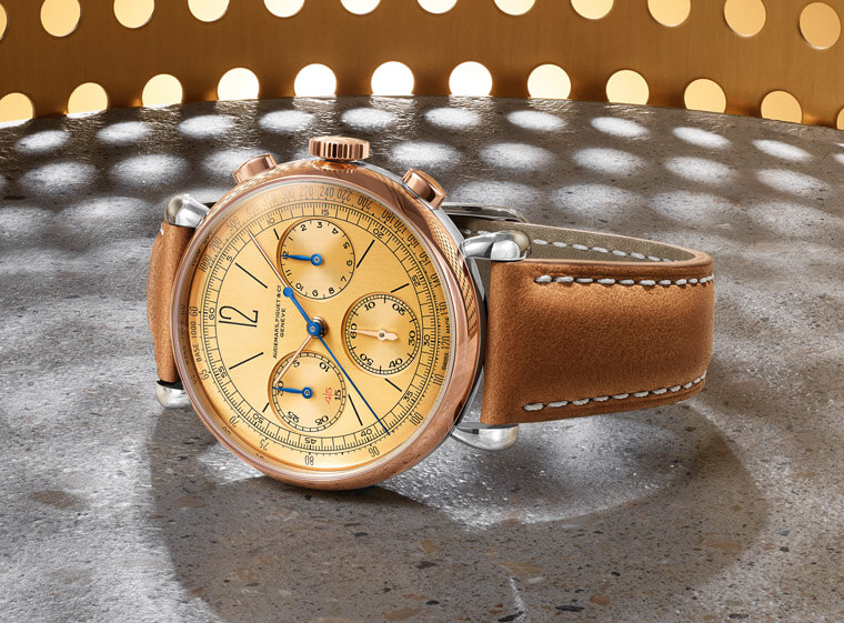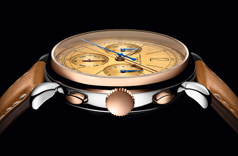 眼光移至[Re]master01的面盤,它那特別經過打磨的黃金面盤與錶殼的半金組合形成豐富的視覺色彩層次,面盤的細節如外緣設有移印的藍色測速計刻度、黑色時標,搭配玫瑰金時、分與小秒針,另外計時指針則是經過藍鋼處理以與走時指針做出區隔。此外面盤12點方向移印的品牌字樣也很有「時代感」,有別於現代愛彼手錶系列所放的品牌Logo,這款錶印上的字樣乃是”AUDEMARS PIGUET & Co GENÈVE”,從中可以看出品牌早期經營公司的策略(據說當時印上日內瓦字樣對於手錶經銷有實質功用),這點也再次強化了[Re]master01發揚古董錶精神的核心概念。