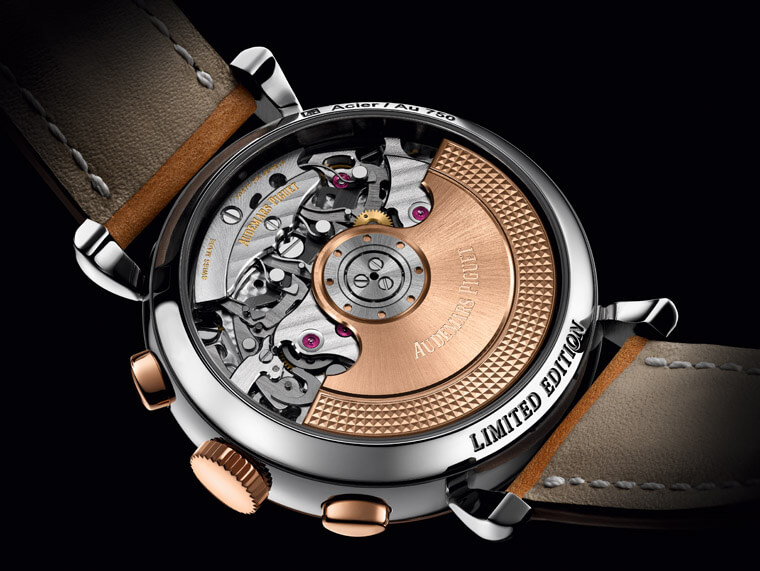 早期手錶往往採用實底蓋提供機芯比較周全的保護,但是到了現代由於製錶技術進步、人們賞玩機芯的需求提升,因此[Re]master01沒有完全比照1533計時碼錶,而是換上了藍寶石透明底蓋,底下露出的4409自動機芯顯然是從品牌2019年為了CODE 11.59系列新創作的4401機芯衍生而來,兩枚計時機芯的規格相仿,包括直徑、寶石數、震頻與動力儲存數,不過由於4409機芯不設日期顯示,因此它零件數(349枚)自然也比4401機芯要少一些。4409機芯配置的是22K玫瑰金自動盤,自動盤邊緣鐫刻上巴黎釘紋來自愛彼1950年代古董錶的特色,此外在這枚機芯結構中也可見到導柱輪等傳統計時碼錶重要的零件,至於愛彼身為高級製錶品牌的功力,從機芯零件的打磨修飾就能看得清清楚楚。最後在底蓋6點方向刻上了限量版字樣,暗示[Re]master01只少量發行500只的收藏價值。愛彼在2020年首發的重點作品雖然有點意外是走復刻路線,但是品牌一方面捕捉古董錶的精髓,同時也結合現代製錶工藝的精髓,使得這款外觀古樸的作品,在功能與品質的內涵表現上,均展現出較原版青出於藍的水準