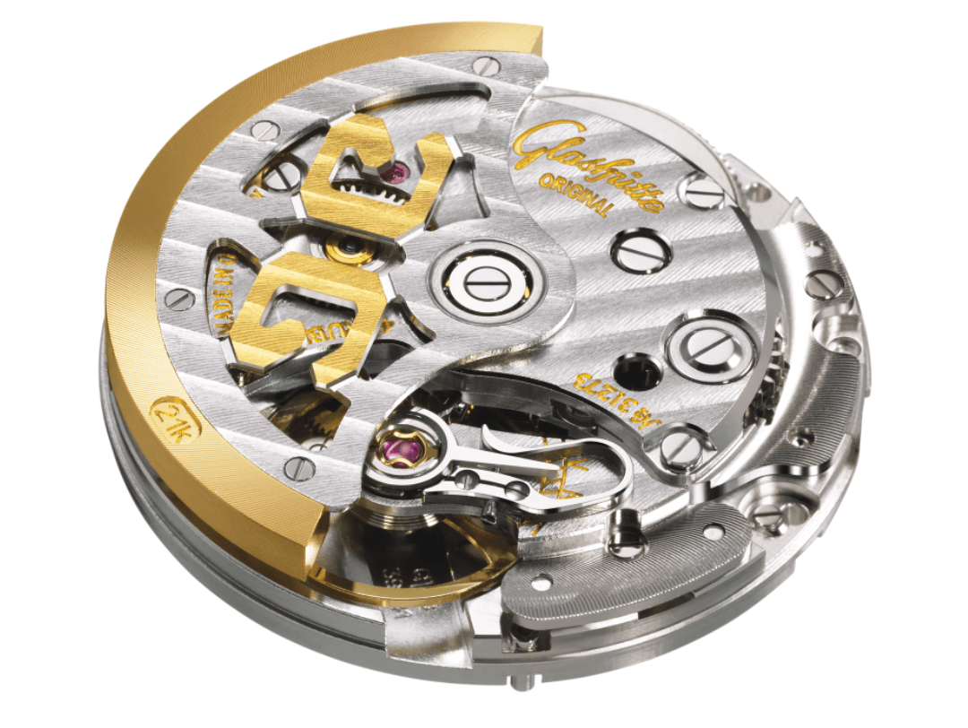 ▲在機芯上可以看到格拉蘇蒂條紋飾面和21K金鏤空自動盤。