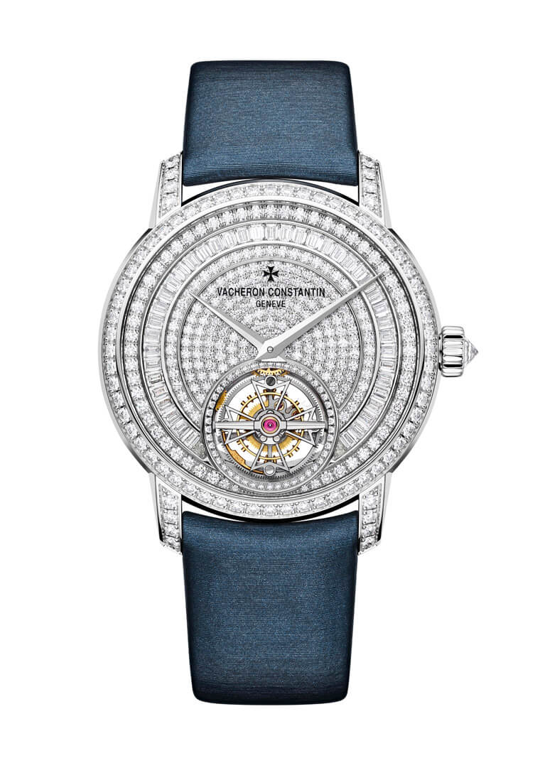 另外一款Traditionnelle陀飛輪珠寶錶外觀有更華麗的鑽石裝飾,其同樣配置39毫米白金錶殼,除了錶殼一樣鑲了208顆圓形明亮式切割鑽石、錶冠也鑲了款圓形明亮式切割鑽石外,它與玫瑰金款最大的不同就是連面盤都鑲滿美鑽,總計面盤上共鑲有43顆長方形切割鑽石和圓形明亮式切割鑽石,另外陀飛輪框架周圍又還有46顆圓形明亮式切割鑽石,數量龐大的鑽石加上又是採用不同切割方式拼綴而成,營造出手錶雍容華貴的姿態,也打破傳統珠寶錶總是以造型優美為主、功能複雜度為輔的刻板印象,在裝飾工藝以及複雜工藝層面展現出高度的平衡。這款錶搭配藍色緞面錶帶,白金錶扣上能見到36顆圓形明亮式切割鑽石,佩戴者在日常活動時總能不經意發出晶耀璀璨的光芒。