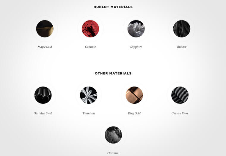 宇舶的標語「融合的藝術」並非只是一個空喊的口號,而是實際貫徹到腕錶身上的理念。歷來Big Bang Unico腕錶的三明治錶殼不僅以鉑金、皇金、不鏽鋼等金屬製作,其中的零件甚至也會蘊含橡膠、鋁、鈦、碳纖維、鋯、陶瓷乃至透明的藍寶石水晶等等材質,近年品牌也再度試著將其珠寶鑲嵌工藝導入腕錶創作,一方面展現品牌於材質研發方面的技術水準,同時也讓腕錶外觀富有層次與魅力。