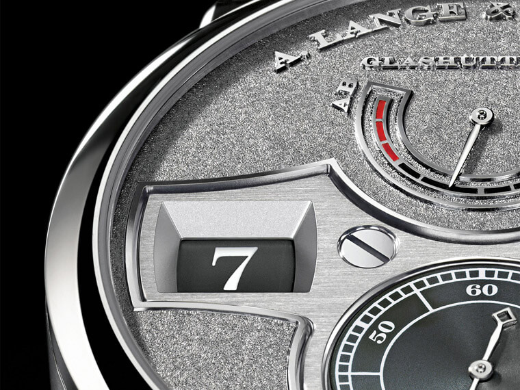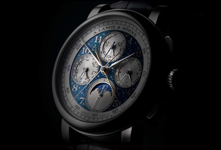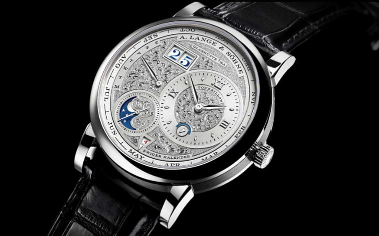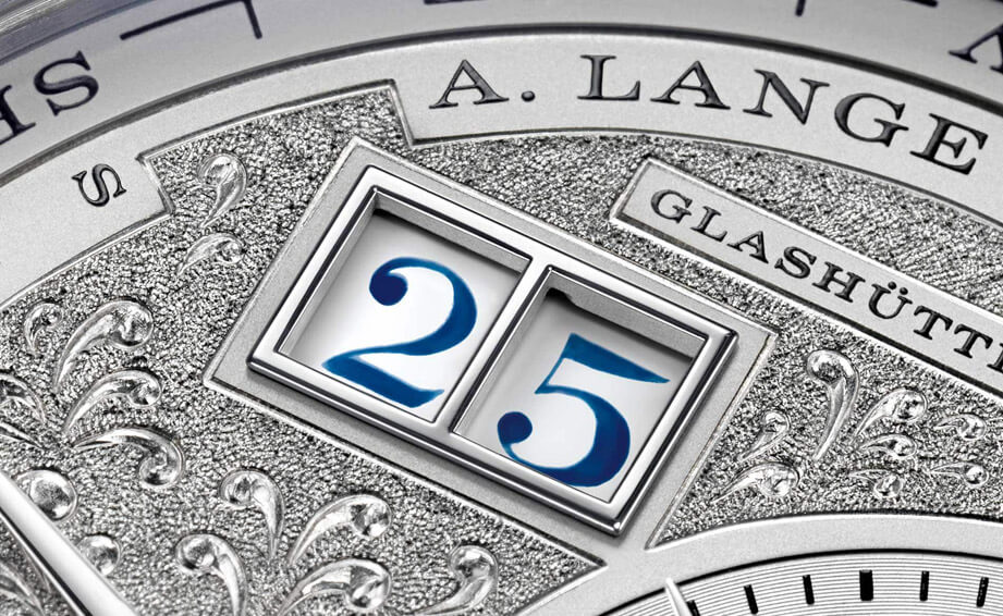 錶款的大日期顯示結合手繪藍色數字,與設計雋永的Tremblage手工雕刻和浮雕面盤相互映襯。這款錶配備朗格專利停秒裝置的陀飛輪、具大日期顯示的萬年曆、星期顯示、月份環、閏年和月相顯示以及日/夜指示,屬於Lange 1系列工藝最複雜的作品。