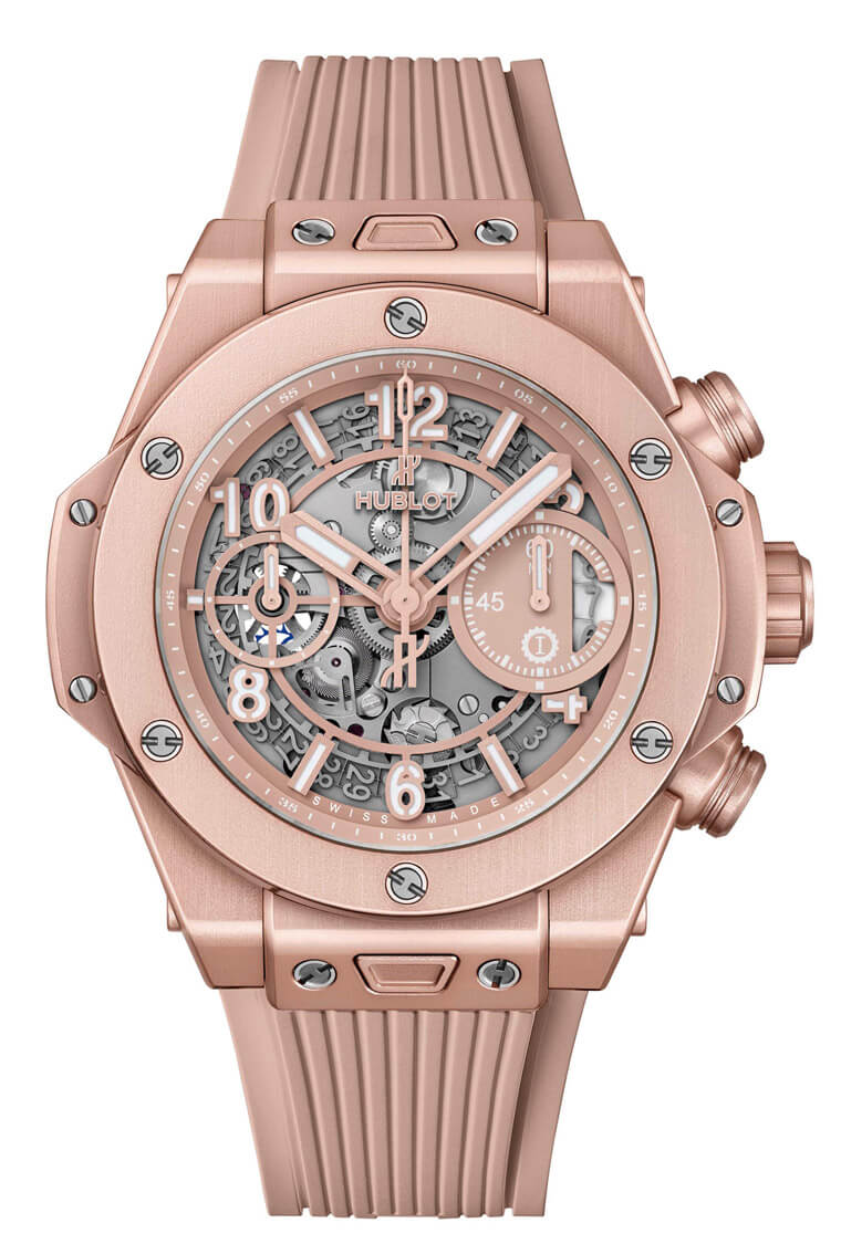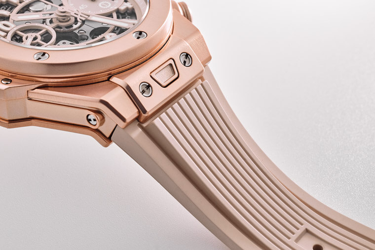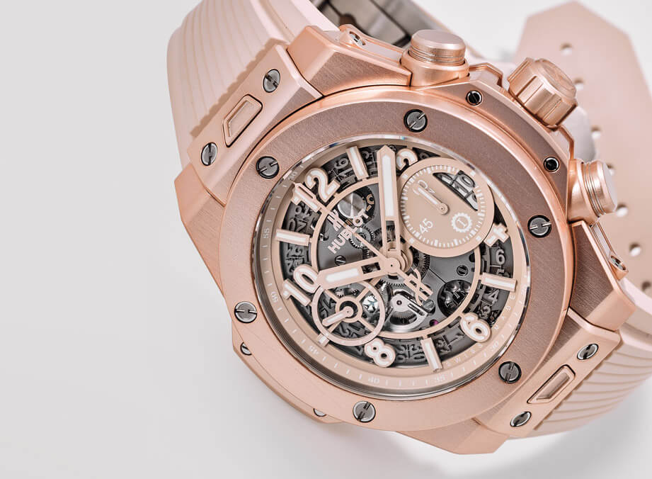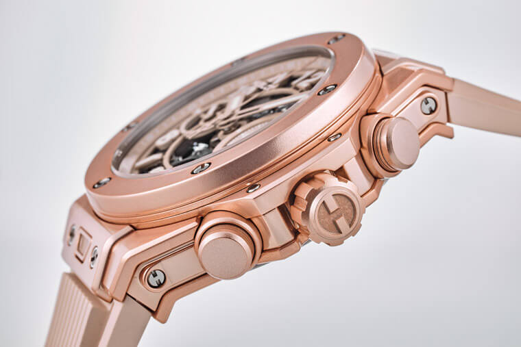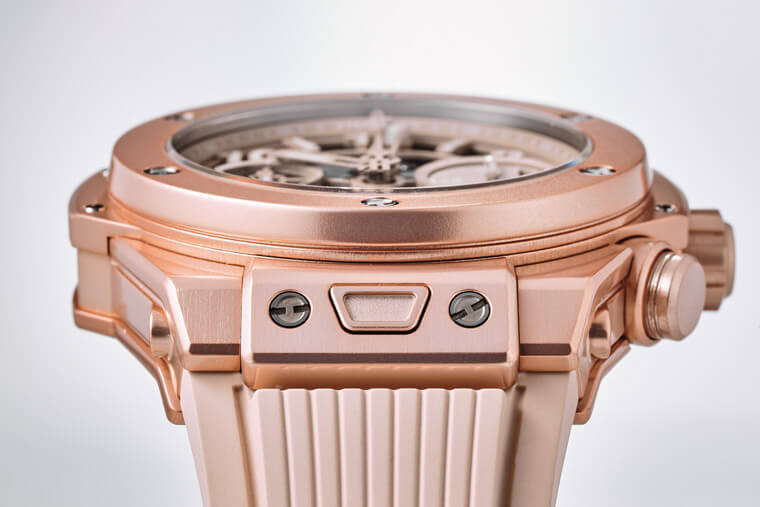 由於Big Bang Millennial Pink的錶徑為42mm,從中透露出它搭載的是宇舶前兩年才剛開發出的新世代Unico機芯HUB 1280,這枚機芯深度地革新了內部設計,品牌在研發它的過程中也再額外融入多項專利設計,例如震盪秒針離合機制與可調校的滾珠軸承計時碼錶磨擦系統等等。你可能對機芯的細部改造感到不容易一眼就看出,不過HUB 1280還有個優點在於它降低了機芯厚度(直徑與第一代Unico機芯則同樣是30mm),也因此手錶才能從45mm縮減至42mm,佩戴上手的負擔感由此減少,也很符合手錶外觀予人的輕盈活力感,另外別忘了它是鋁材質,代表手錶會更輕一些、從而提升佩戴的舒適度。