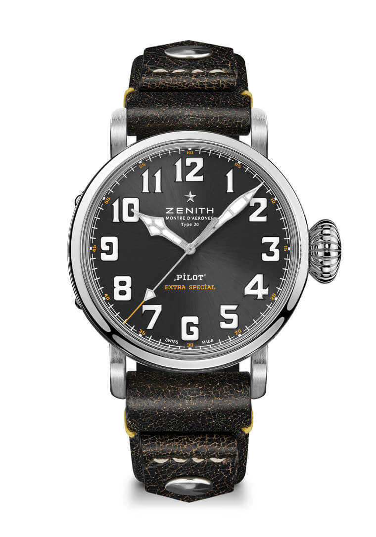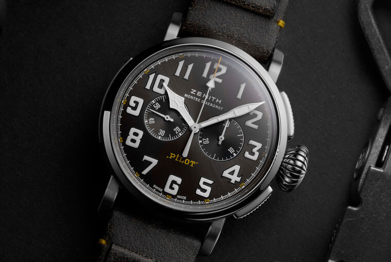 這款飛行錶面盤還有一些值得注意的細節,如12點方向和6點方向分別印有”MONTRE D’AERONEF”與”PILOT”字樣,勾起佩戴者回憶起品牌是最早生產飛行錶的品牌之一;換句話說,這些看似不起眼的文字,其實也正說明了真力時製作飛行錶的代表性。