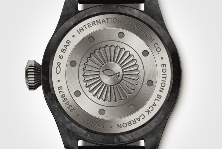 IWC在2020年推出過一款Big Pilot大飛系列的限量款”Black Carbon”(IW506101),除了手錶錶殼是用碳纖維材質製作,且全球只發行100只引人注目外,這款錶還有個特別之處在於錶冠上的圖案從IWC的Logo改成了一個有點熟悉卻又陌生的「魚」圖案。