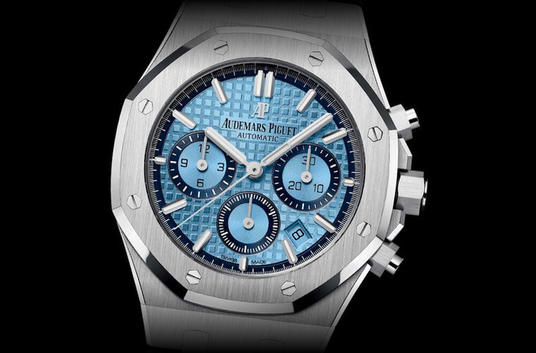 新款採用高貴的金錶殼形成與系列既有款包括白面藍圈與灰面銀圈的不鏽鋼材質有別的新局面,原本38mm的皇家橡樹計時碼錶面盤配色多半是傳統的白面或銀面,但是這款換上了整個系列乃至全愛彼旗下都少見的淺藍面瞬間在系列中顯得相對搶眼。