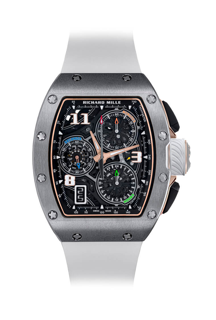 RM 72-01還有個特點在於現在計時碼錶的小錶盤往往愈做愈精簡,例如有些手錶會省下12小時計時盤,或把分鐘計時限定在30分鐘以內等等,這是因為今日還會想要手錶紀錄時間的人似乎已經愈來愈少,但是RICHARD MILLE顯然不這麼想,他們覺得計時功能設來就是要被使用,而如果要使用的話有備絕對無患,所以RM 72-01的計時錶盤分別是60分鐘計時與24小時計時,倘若真的需要用到手錶紀錄比較長的時間,這時就是RM 72-01大顯神威的時刻。