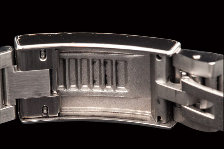 ▲一本潛水錶的專業,錶扣的內側有可以微調長度的活動關節,只要將錶帶掀至反向就可以進行一格2mm、總長20mm的長度調整,方便適應佩戴環境的變化。