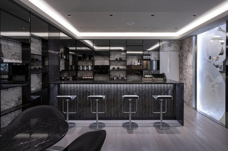 走進Le Café店內,迎面而來的印象包括大理石牆面、木質地板以及黑色鏡面壁櫃等等,風格簡約俐落又充滿現代感,當初RICHARD MILLE會在此設立咖啡店的目的或許是想讓人在走走逛逛累了的時候有一個可以稍微放鬆休息的地方,讓人覺得頗為貼心,