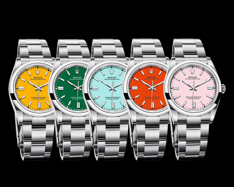 勞力士2020年新推出Oyster Perpetual,除了尺寸重新調整為28、31、34、36、41mm之外(刪除26mm與39mm、新增28mm和41mm),最大亮點就是導入Lacquer漆面面盤,共有包括糖果粉紅色、綠松石、黃色、珊瑚紅色及綠色等五種顏色,雖說Oyster Perpetual本來就以面盤配色多元聞名,但是漆面和系列既有的太陽光線面盤看起來就是有一點微妙的差別——後者看起來會隨著光線照射產生色澤深淺變化,前者的顏色則顯得更飽和明亮,憑心而論兩種面盤各有各的吸引力,而且勞力士也並非出了漆面面盤就捨棄太陽光線面盤,如2020年41mm尺寸也有銀色或黑色太陽光線面盤登場,不過兩種面盤比較起來,相對之下比較讓人有新鮮感的漆面還是引起較多的討論與關注。