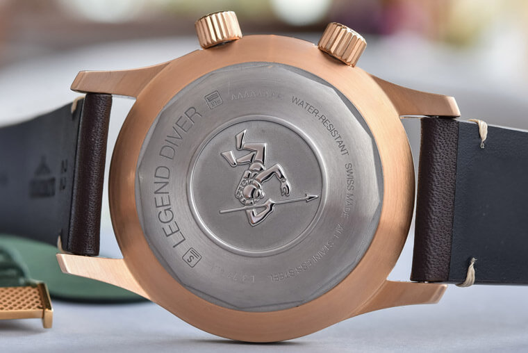 Legend Diver Bronze的錶殼維持系列傳統的42mm大小,浪琴表以青銅材質分別打造錶殼與錶冠等零件,唯獨錶背實底蓋因為考量到可能有些佩戴者皮膚比較容易敏感的問題,因此品牌貼心地將實底蓋換成擁有優異親膚性的鈦金屬材質,底蓋也依舊鐫刻一名潛水員圖案連結系列的歷史淵源以及潛水錶身份。