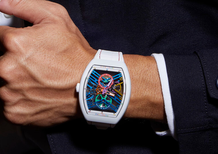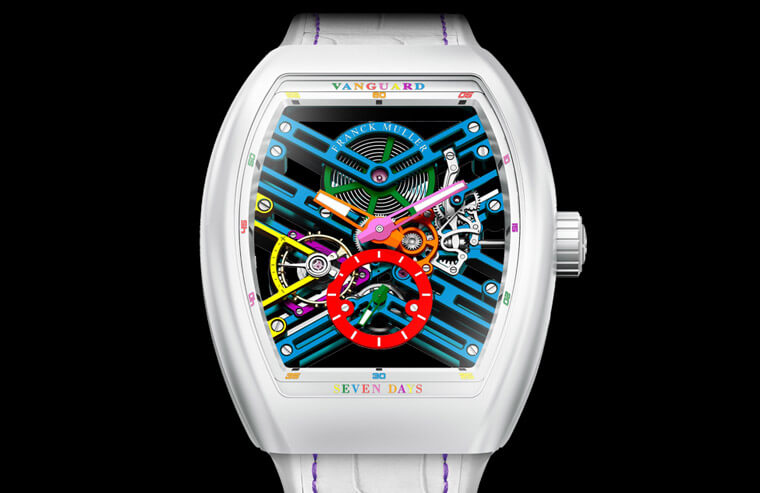 這幾年「彩虹」成為想要一種與夯錶相關的重要關鍵字,因為前幾年勞力士Daytona 116595RBOW開始帶起了一股讓人眼睛吃冰淇淋的彩色旋風,由於116595RBOW引起許多名人望族爭相收藏,導致市面上也出現愈來愈多具有類似彩色寶石錶圈的作品,發展到2020年這種彩虹風潮方向未艾,不管是連錶殼鑲滿彩寶的款式,或是僅用彩色時標來達到炫目效果的設計,又或者是像寶齊萊Patravi TravelTec這種單色但一次出很多種顏色的彩色錶,都算是彩虹風潮的一員;而最近製錶向來以大膽聞名的FRANCK MULLER也提出了自己的彩虹新觀點,透過品牌新作Vanguard 7 Days Power Reserve Skeleton詮釋屬於FM的花花世界。