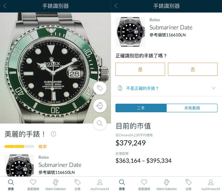 下載完Chrono24 App,畫面最上面就是手錶識別器功能,點進去之後你可以選擇從手機照片庫裡面上傳照片辨識手錶,或是利用App的相機功能直接拍攝手錶或錶圖,上傳完或拍好照送出很快就會有結果,這時App會秀出一張它們辨識完結果的手錶照片、品牌名、系列名和型號等資訊,接著還會貼心的問你一句:「正確識別您的手錶了嗎?如果是的話當然就太棒了,手機螢幕就繼續往下滑可以挑選你想找目前該只錶的二手錶行情或是未佩戴過全新款式的行情,然後底下會秀出該款錶目前在Chrono24網站的平均價格以及賣家們在網站上銷售這款錶的價位區間;再來下方又還會有手錶更詳細的資料,包括錶殼材質、面盤顏色、出產年份等等的資訊。