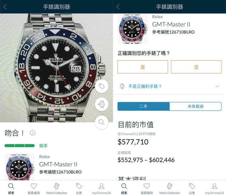 根據小編實際測試的結果發現,基本上有上傳照片或拍攝手錶照片都會跳出搜尋結果,系統會自動找到它判斷「長得」最接近的手錶款式,當然如果品牌或手錶本身太冷門,顯示出的結果就會有很大的誤差。但如果是像一些人氣品牌如勞力士、沛納海等,基本上就算不是找到完全一樣的款式,但其實正確率也都還算高(例如搜尋今年的新款綠水鬼,但結果卻跑出舊款黑水鬼,可是這部分也是能透過手動輸入品牌與手錶型號等資訊加以微調來找到正確結果),用起來還滿方便的,如果大家有興趣的話,不妨去下載這個App來試試看,你應該會對於他們資料庫的整齊度感到驚豔。