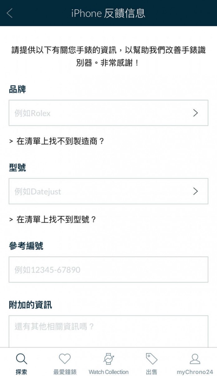 而如果手錶識別器光用照片檢視第一時間顯示的不是你想找的手錶,你只要在掃瞄結果出爐時,點選識別結果下方的「否」選項,那麼App就會跳出可以手動輸入手錶資訊的頁面,做為照片掃瞄器的補強之用。