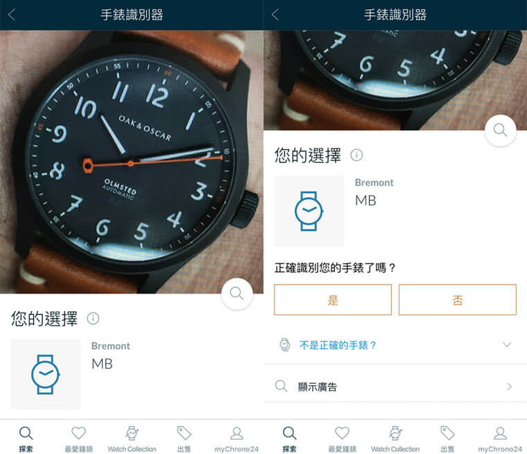 ▲如果拍照搜尋顯示的結果有出入,使用者可以點選「否」的選項,接著自行輸入手錶相關資訊以進行更精確的搜搜。