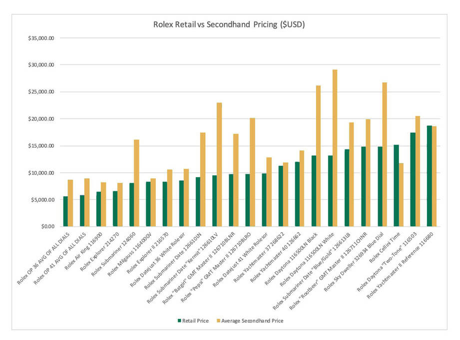 要知道手錶的定價並不難,因為這是透明公開的資訊,只要直接去勞力士官網他們都一一列清楚在上頭了,比較傷腦筋的是要如何取得所謂的「實際市場成交價格」,由於每家二手錶店銷售手錶並沒有一個公定價,視他們進貨成本以及想要賺取多少的利潤,使得每款手錶在不同的店家都會有不一樣的價格,關於這點,外媒是採用統計分析的方式,從著名二手錶交易網站Chrono24以及一些國際知名的二手錶店如Bob’s Watches、WatchBox和Watchfinder等在錶迷心中具有代表性的平台取得每款手錶各自的報價,最後再加以整理算出一個平均的價格來代表某款錶目前的市場價值。