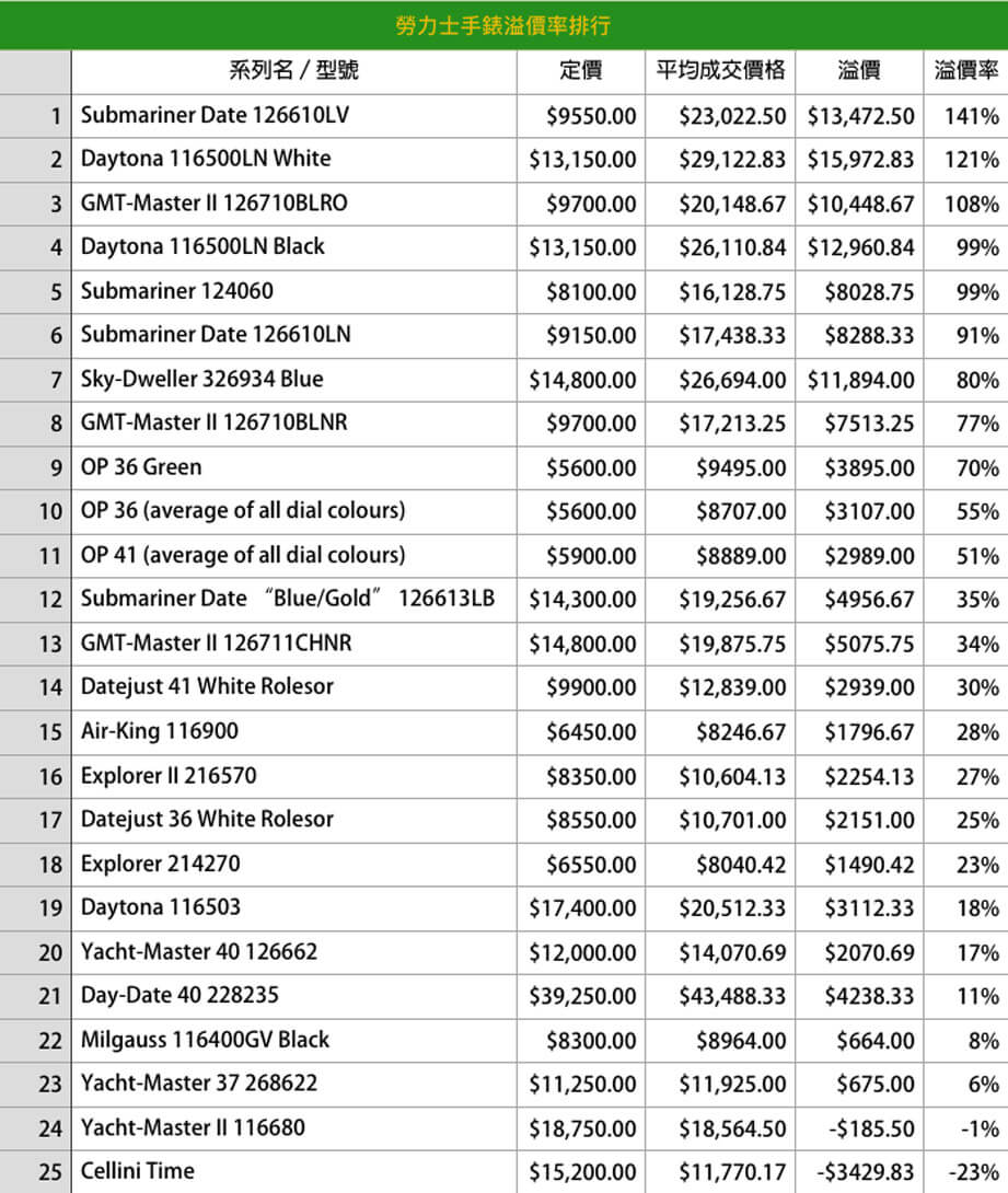 前5名當中實際上還是由Daytona、Submariner以及GMT-Master II等勞力士3大系列領銜,足可証明它們是最保值的勞力士手錶,而你可能會對這份榜單感到好奇,以下我們就按照溢價率高低列出外媒整理的這份榜單讓大家參考(以下列出金額單位為美金)。